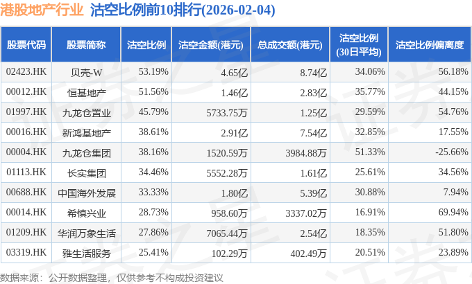 从沽空比例来看,贝壳-W、恒基地产、九龙仓置业沽空比例位居行业前三,分别为53.19%、51.56%、45.79%。