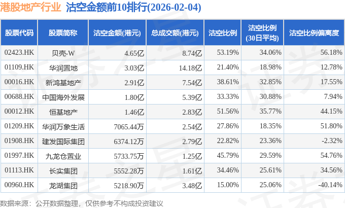 从沽空金额来看,贝壳-W、华润置地、新鸿基地产沽空金额位居行业前三,分别为4.65亿港元、3.03亿港元、2.91亿港元。