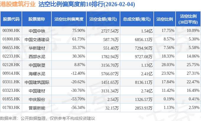从沽空比例偏离度来看,中国中铁、中国交通建设、华新建材沽空比例偏离度位居行业前三,分别为75.9%、61.73%、35.37%。