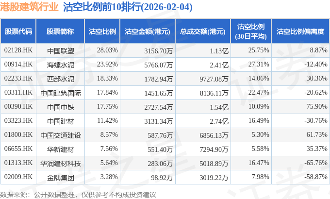 从沽空比例来看,中国联塑、海螺水泥、西部水泥沽空比例位居行业前三,分别为28.03%、23.92%、18.33%。