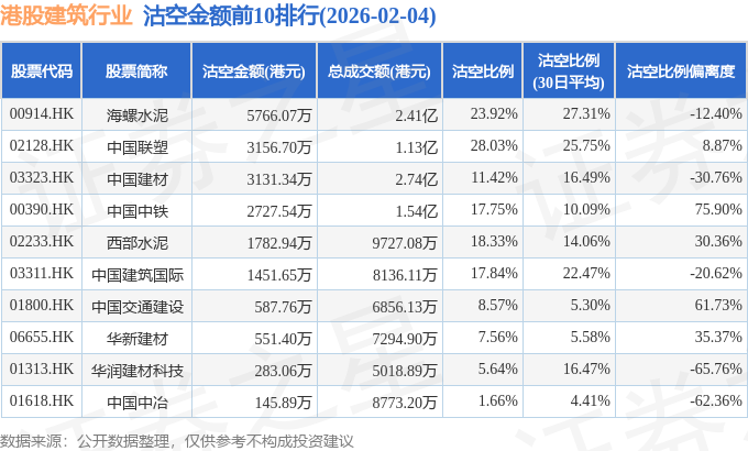 从沽空金额来看,海螺水泥、中国联塑、中国建材沽空金额位居行业前三,分别为5766.07万港元、3156.7万港元、3131.34万港元。