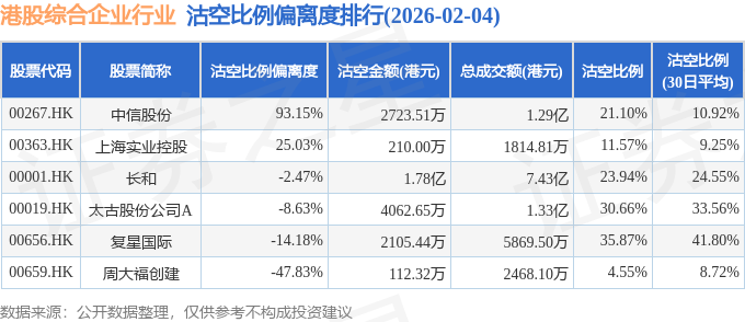 从沽空比例偏离度来看,中信股份、上海实业控股、长和沽空比例偏离度位居行业前三,分别为93.15%、25.03%、-2.47%。