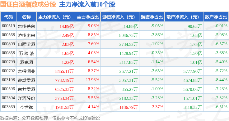 资金流向方面,国证白酒(980031)指数成份股当日主力资金净流入合计22.83亿元,游资资金净流出合计16.64亿元,散户资金净流出合计6.2亿元。成份股资金流向详情见下表: