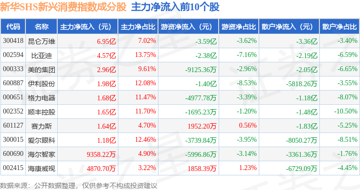 资金流向方面,新华SHS新兴消费(989006)指数成份股当日主力资金净流入合计17.59亿元,游资资金净流出合计9.0亿元,散户资金净流出合计8.6亿元。成份股资金流向详情见下表: