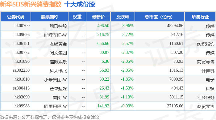 新华SHS新兴消费(989006)指数十大成份股详情如下: