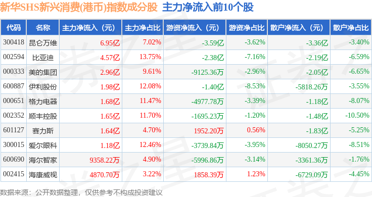 资金流向方面,新华SHS新兴消费(港币)(989007)指数成份股当日主力资金净流入合计17.59亿元,游资资金净流出合计9.0亿元,散户资金净流出合计8.6亿元。成份股资金流向详情见下表: