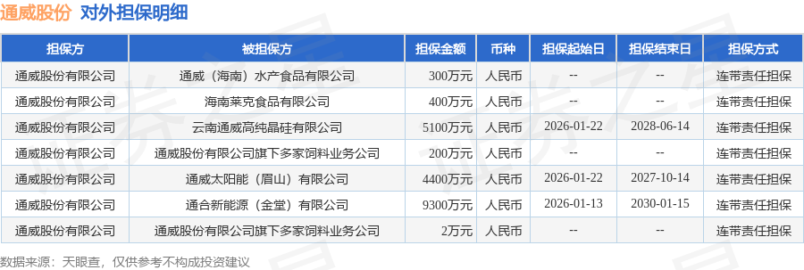 通威股份2月3日披露7笔对外担保,被担保公司6家。对外担保明细如下表: