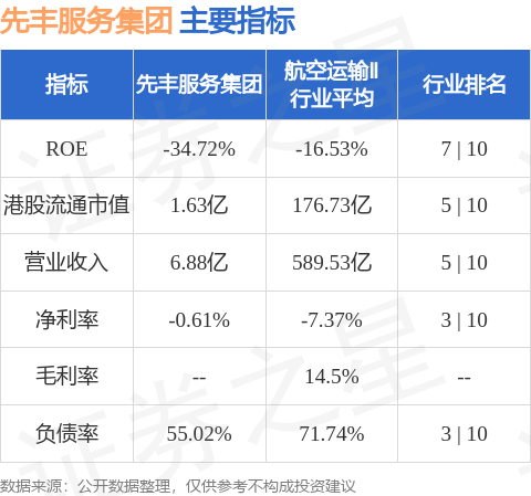 先丰服务集团港股市值1.63亿港元,在航空运输Ⅱ行业中排名第5。主要指标见下表: