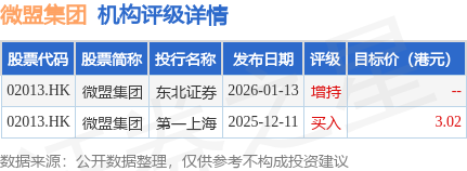 截至2026年2月4日收盘,微盟集团(02013.HK)报收于2.0港元,下跌8.26%,成交量1.88亿股,成交额3.83亿港元。投行对该股的评级以增持为主,近90天内共有1家投行给出增持评级,近90天的目标均价为3.02港元。东北证券最新一份研报给予微盟集团增持评级。
