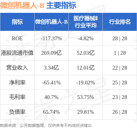 微创机器人-B港股市值269.09亿港元,在医疗器械Ⅱ行业中排名第1。主要指标见下表: