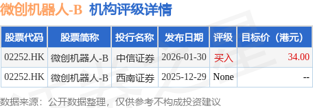截至2026年2月4日收盘,微创机器人-B(02252.HK)报收于25.32港元,下跌3.58%,成交量642.7万股,成交额1.62亿港元。投行对该股的评级以买入为主,近90天内共有1家投行给出买入评级,近90天的目标均价为34港元。中信证券最新一份研报给予微创机器人-B买入评级,目标价34港元。