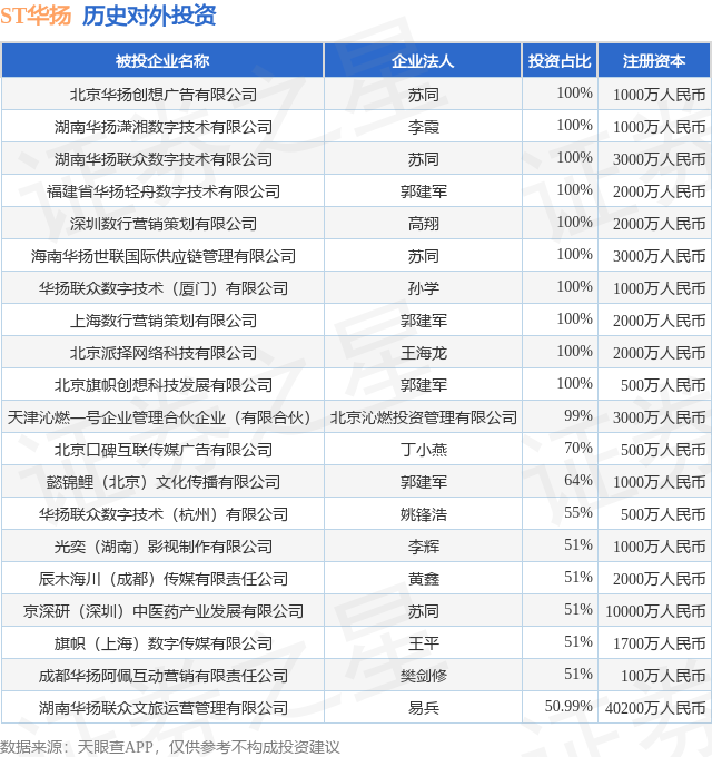 通过天眼查大数据分析,华扬联众数字技术股份有限公司共对外投资了55家企业,参与招投标项目206次;财产线索方面有商标信息281条,专利信息20条,著作权信息235条;此外企业还拥有行政许可7个。据2024年报数据,ST华扬长期股权投资3910.84万元,同比减36.61%。