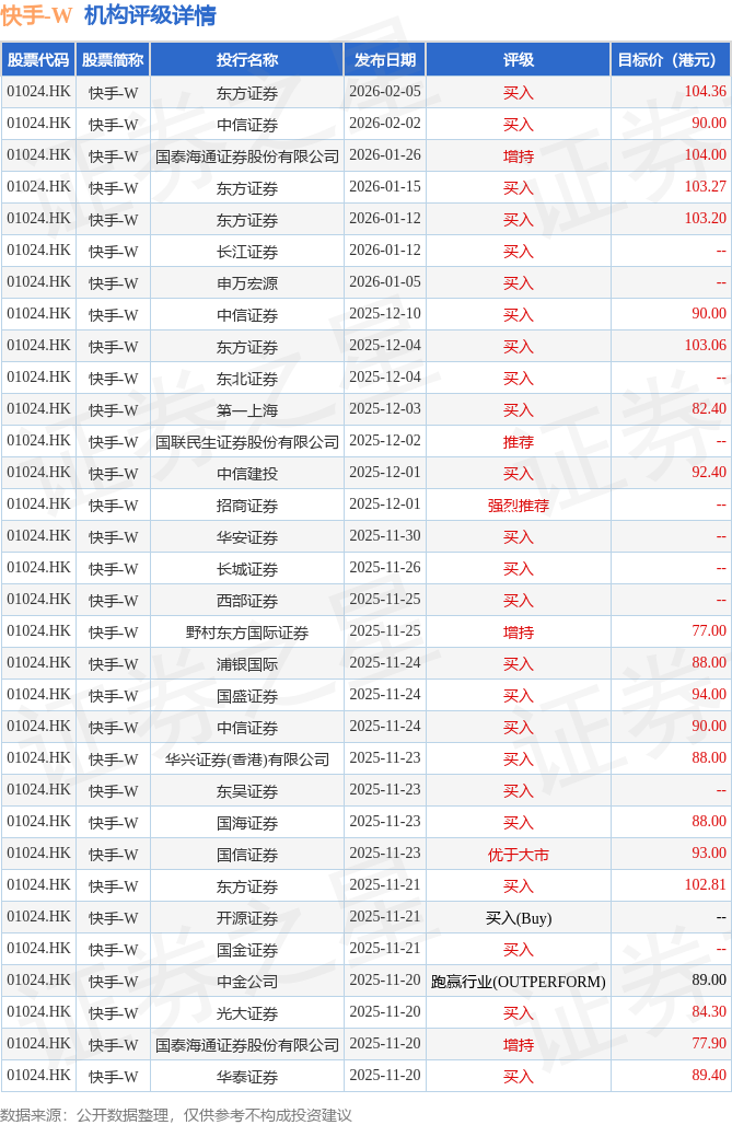投行对该股的评级以买入为主,近90天内共有24家投行给出买入评级,近90天的目标均价为92.1港元。东方证券最新一份研报给予快手-W买入评级,目标价104.36港元。