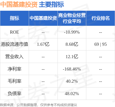 中国基建投资港股市值1.67亿港元,在商业物业经营行业中排名第69。主要指标见下表:
