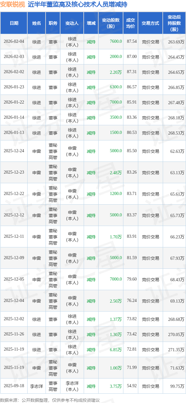 安联锐视近半年内的董监高及核心技术人员增减持详情如下: