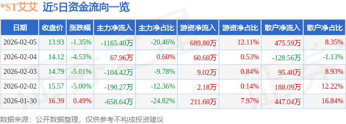 2月5日的资金流向数据方面,主力资金净流出1165.4万元,占总成交额20.46%,游资资金净流入689.8万元,占总成交额12.11%,散户资金净流入475.59万元,占总成交额8.35%。