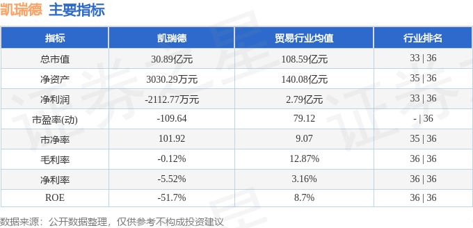 凯瑞德主要指标及行业内排名如下: