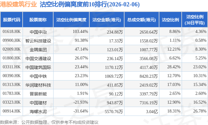 从沽空比例偏离度来看,中国中冶、智云科技建设、金隅集团沽空比例偏离度位居行业前三,分别为103.44%、91.38%、47.14%。