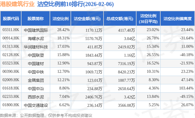 从沽空比例来看,中国建筑国际、海螺水泥、华润建材科技沽空比例位居行业前三,分别为28.42%、18.31%、17.03%。