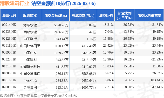 从沽空金额来看,海螺水泥、西部水泥、中国联塑沽空金额位居行业前三,分别为5570.76万港元、2406.76万港元、1843.44万港元。