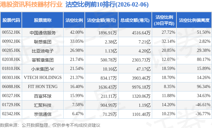 从沽空比例来看,中国通信服务、联想集团、比亚迪电子沽空比例位居行业前三,分别为42%、33.05%、26.98%。