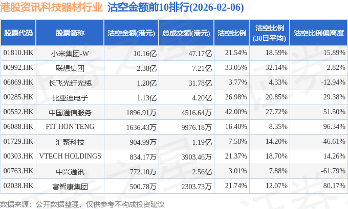 从沽空金额来看,小米集团-W、联想集团、长飞光纤光缆沽空金额位居行业前三,分别为10.16亿港元、2.38亿港元、1.2亿港元。