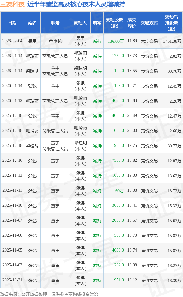 三友科技近半年内的董监高及核心技术人员增减持详情如下: