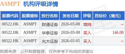 投行对该股的评级以买入为主,近90天内共有2家投行给出买入评级,近90天的目标均价为146港元。财通证券最新一份研报给予ASMPT增持评级。