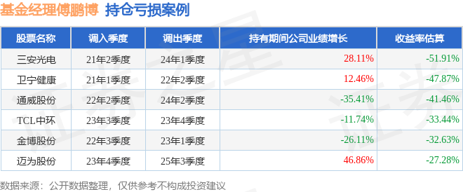 傅鹏博管理的睿远成长价值混合A基金在21年2季度买入三安光电,在持有2年又3个季度后在24年1季度卖出。持有期间的估算收益率为-51.91%,持有期间三安光电在2021年到2024年的年报营业总收入增幅达28.11%。