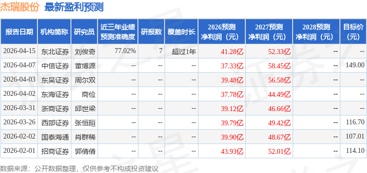 证券之星数据中心根据近三年发布的研报数据计算,东北证券刘俊奇研究员团队对该股研究较为深入,近三年预测准确度均值为77.02%,其预测2026年度归属净利润为盈利41.28亿,根据现价换算的预测PE为28.86。