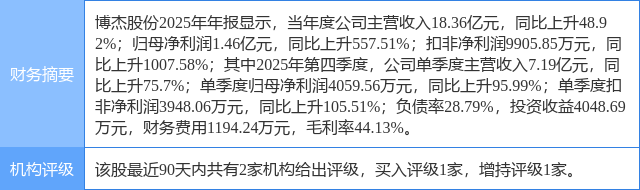 2026年3月19日,中邮证券研究员吴文吉发布了对博杰股份的研报《创新为锚,破浪智能制造新蓝海》,该研报对博杰股份给出“买入”评级。研报中预计公司2025/2026/2027年分别实现收入17.31/23.69/29.27亿元,分别实现归母净利润1.48/3.64/4.59亿元,首次覆盖,给予“买入”评级。证券之星数据中心根据近三年发布的研报数据计算,该研报作者对此股的盈利预测准确度为79.08%。