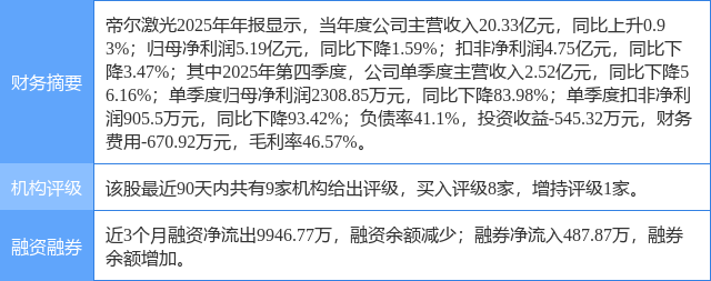 2026年3月31日,国金证券研究员姚遥发布了对帝尔激光的研报《以光伏为基,打造双轮驱动新格局》,该研报对帝尔激光给出“买入”评级。研报中预计公司2026-2028年盈利分别为6.7/7.8/8.9亿元,对应EPS为2.43、2.86、3.25元,当前股价对应PE分别为31/26/23倍,维持“买入”评级。证券之星数据中心根据近三年发布的研报数据计算,该研报作者对此股的盈利预测准确度为68.07%。