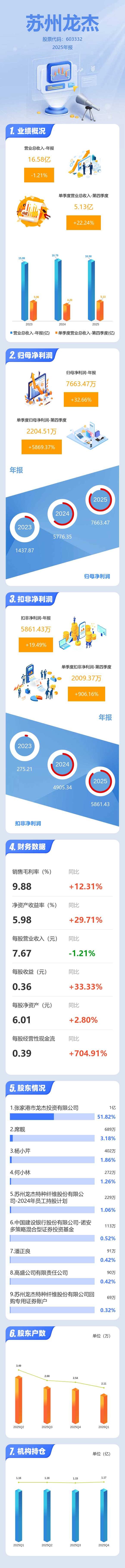 证券之星消息,苏州龙杰2025年年报显示,当年度公司主营收入16.58亿元,同比下降1.21%;归母净利润7663.47万元,同比上升32.67%;扣非净利润5861.43万元,同比上升19.49%;其中2025年第四季度,公司单季度主营收入5.13亿元,同比上升22.24%;单季度归母净利润2204.51万元,同比上升5869.37%;单季度扣非净利润2009.37万元,同比上升906.16%;负债率12.94%,投资收益925.95万元,财务费用-105.59万元,毛利率9.88%。
