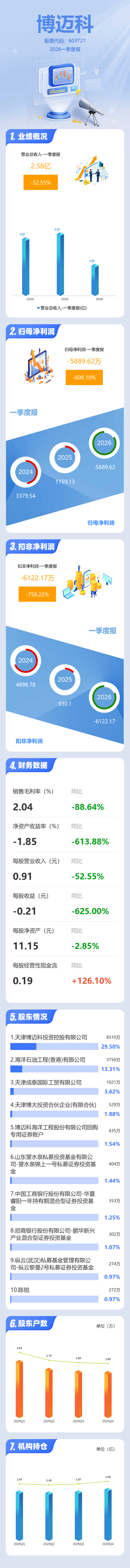 证券之星消息,博迈科2026年一季报显示,一季度公司主营收入2.58亿元,同比下降52.56%;归母净利润-5889.62万元,同比下降608.11%;扣非净利润-6122.17万元,同比下降758.23%;负债率29.23%,投资收益196.09万元,财务费用-2934.78万元,毛利率2.04%。