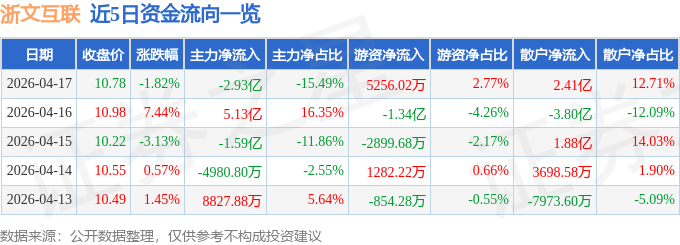 证券之星消息,截至2026年4月17日收盘,浙文互联(600986)报收于10.78元,下跌1.82%,换手率11.76%,成交量174.96万手,成交额18.94亿元。