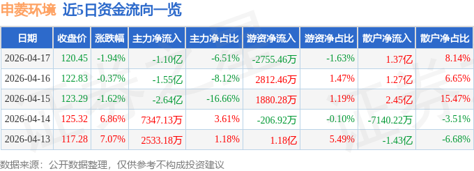 证券之星消息,截至2026年4月17日收盘,申菱环境(301018)报收于120.45元,下跌1.94%,换手率7.06%,成交量13.96万手,成交额16.88亿元。