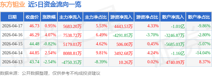证券之星消息,截至2026年4月17日收盘,东方钽业(000962)报收于46.73元,上涨0.95%,换手率4.35%,成交量21.83万手,成交额10.27亿元。