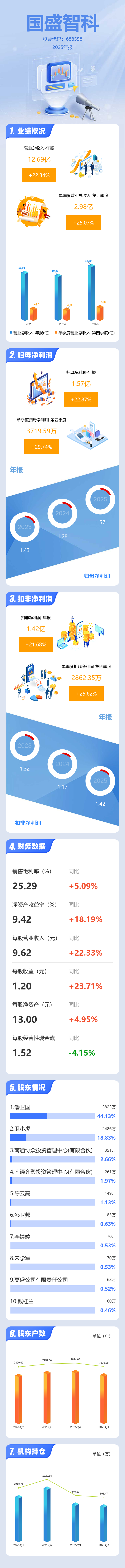 证券之星消息,国盛智科2025年年报显示,当年度公司主营收入12.69亿元,同比上升22.34%;归母净利润1.57亿元,同比上升22.87%;扣非净利润1.42亿元,同比上升21.68%;其中2025年第四季度,公司单季度主营收入2.98亿元,同比上升25.08%;单季度归母净利润3719.59万元,同比上升29.75%;单季度扣非净利润2862.35万元,同比上升25.63%;负债率26.37%,投资收益1501.63万元,财务费用-214.03万元,毛利率25.29%。