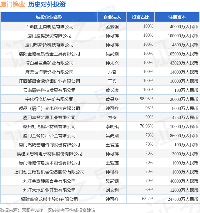 证券之星消息,根据天眼查APP显示,厦门钨业(600549.SH)新增一起对外投资事件,被投资公司为九江大地矿业开发有限公司,法定代表人刘文利,投资占比为69%。该公司从事开采专业及辅助性活动,注册资本为12000万人民币。目前,厦门钨业共存在对外投资45项,投资占比前20的项目见下表: