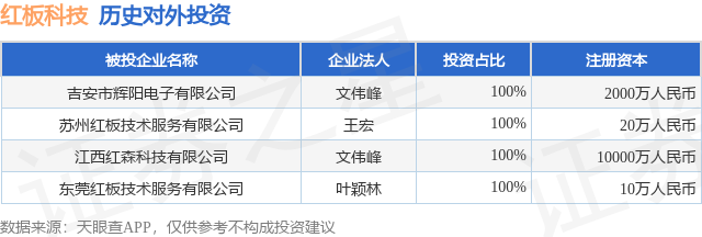 证券之星消息,根据天眼查APP显示,红板科技(603459.SH)新增一起对外投资事件,被投资公司为吉安市辉阳电子有限公司,法定代表人文伟峰,投资占比为100%。该公司从事计算机、通信和其他电子设备制造业,注册资本为2000万人民币。目前,红板科技共存在对外投资4项,详见下表: