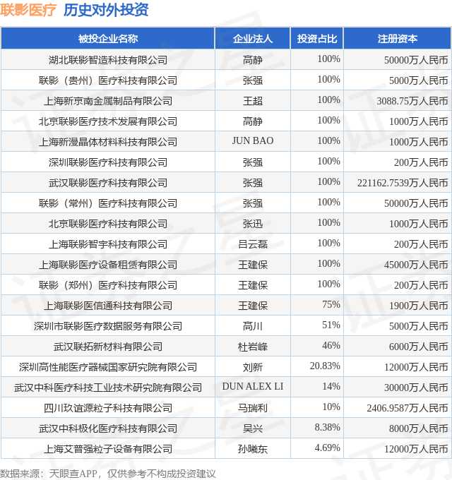 证券之星消息,根据天眼查APP显示,联影医疗(688271.SH)新增一起对外投资事件,被投资公司为湖北联影智造科技有限公司,法定代表人高静,投资占比为100%。该公司从事科技推广和应用服务业,注册资本为50000万人民币。目前,联影医疗共存在对外投资22项,投资占比前20的项目见下表: