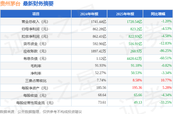 据证券之星公开数据整理,近期贵州茅台(600519)发布2025年年报。根据财报显示,贵州茅台净利润同比下降4.53%。截至本报告期末,公司营业总收入1720.54亿元,同比下降1.2%,归母净利润823.2亿元,同比下降4.53%。按单季度数据看,第四季度营业总收入411.5亿元,同比下降19.35%,第四季度归母净利润176.93亿元,同比下降30.34%。