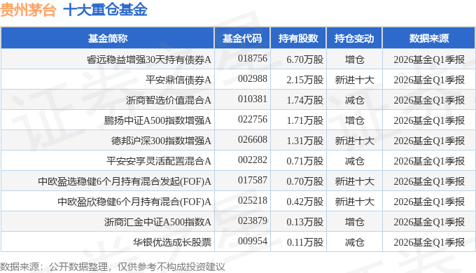 持有贵州茅台最多的基金为睿远稳益增强30天持有债券A,目前规模为88.99亿元,最新净值1.1241(4月17日),较上一交易日下跌0.17%,近一年上涨9.2%。该基金现任基金经理为侯振新。