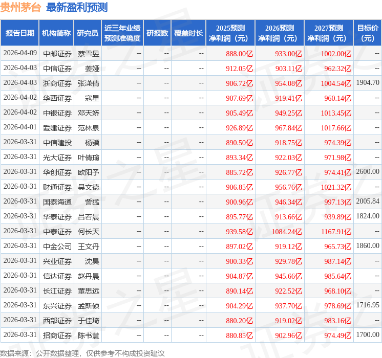 分析师工具显示:证券研究员普遍预期2026年业绩在919.12亿元,每股收益均值在73.4元。
