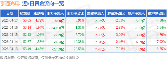 证券之星消息,截至2026年4月17日收盘,亨通光电(600487)报收于55.65元,上涨4.72%,换手率8.73%,成交量213.42万手,成交额115.81亿元。
