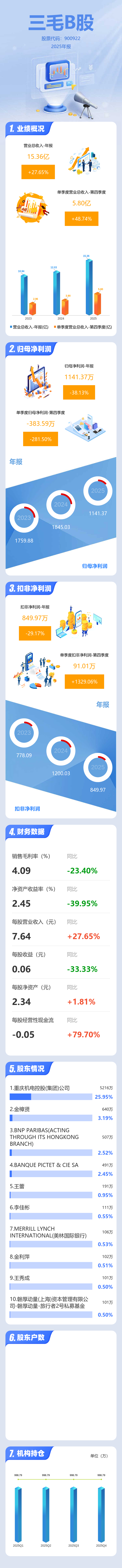 证券之星消息,三毛B股2025年年报显示,当年度公司主营收入15.36亿元,同比上升27.66%;归母净利润1141.37万元,同比下降38.14%;扣非净利润849.97万元,同比下降29.17%;其中2025年第四季度,公司单季度主营收入5.8亿元,同比上升48.75%;单季度归母净利润-383.59万元,同比下降281.5%;单季度扣非净利润91.01万元,同比上升1329.06%;负债率56.35%,投资收益767.04万元,财务费用-344.34万元,毛利率4.09%。