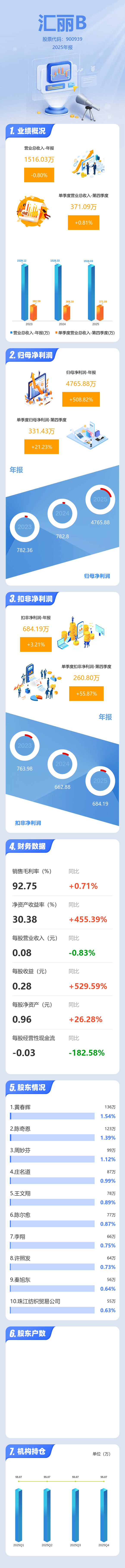 证券之星消息,汇丽B2025年年报显示,当年度公司主营收入1516.03万元,同比下降0.81%;归母净利润4765.88万元,同比上升508.83%;扣非净利润684.19万元,同比上升3.21%;其中2025年第四季度,公司单季度主营收入371.09万元,同比上升0.81%;单季度归母净利润331.43万元,同比上升21.24%;单季度扣非净利润260.8万元,同比上升55.88%;负债率11.94%,投资收益5171.11万元,财务费用-202.2万元,毛利率92.75%。