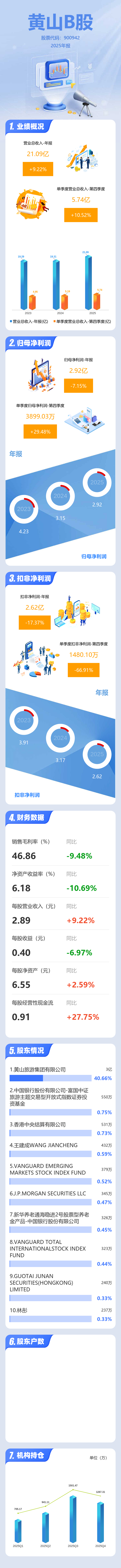 证券之星消息,黄山B股2025年年报显示,当年度公司主营收入21.09亿元,同比上升9.23%;归母净利润2.92亿元,同比下降7.15%;扣非净利润2.62亿元,同比下降17.38%;其中2025年第四季度,公司单季度主营收入5.74亿元,同比上升10.52%;单季度归母净利润3899.03万元,同比上升29.49%;单季度扣非净利润1480.1万元,同比下降66.92%;负债率18.52%,投资收益-2020.17万元,财务费用522.81万元,毛利率46.86%。