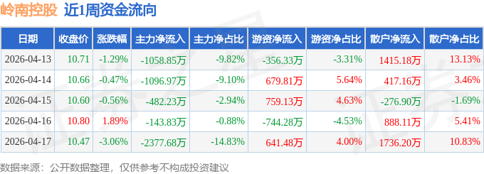 资金流向数据方面,本周岭南控股主力资金合计净流出5159.57万元,游资资金合计净流入979.81万元,散户资金合计净流入4179.76万元。本周资金流向一览见下表:
