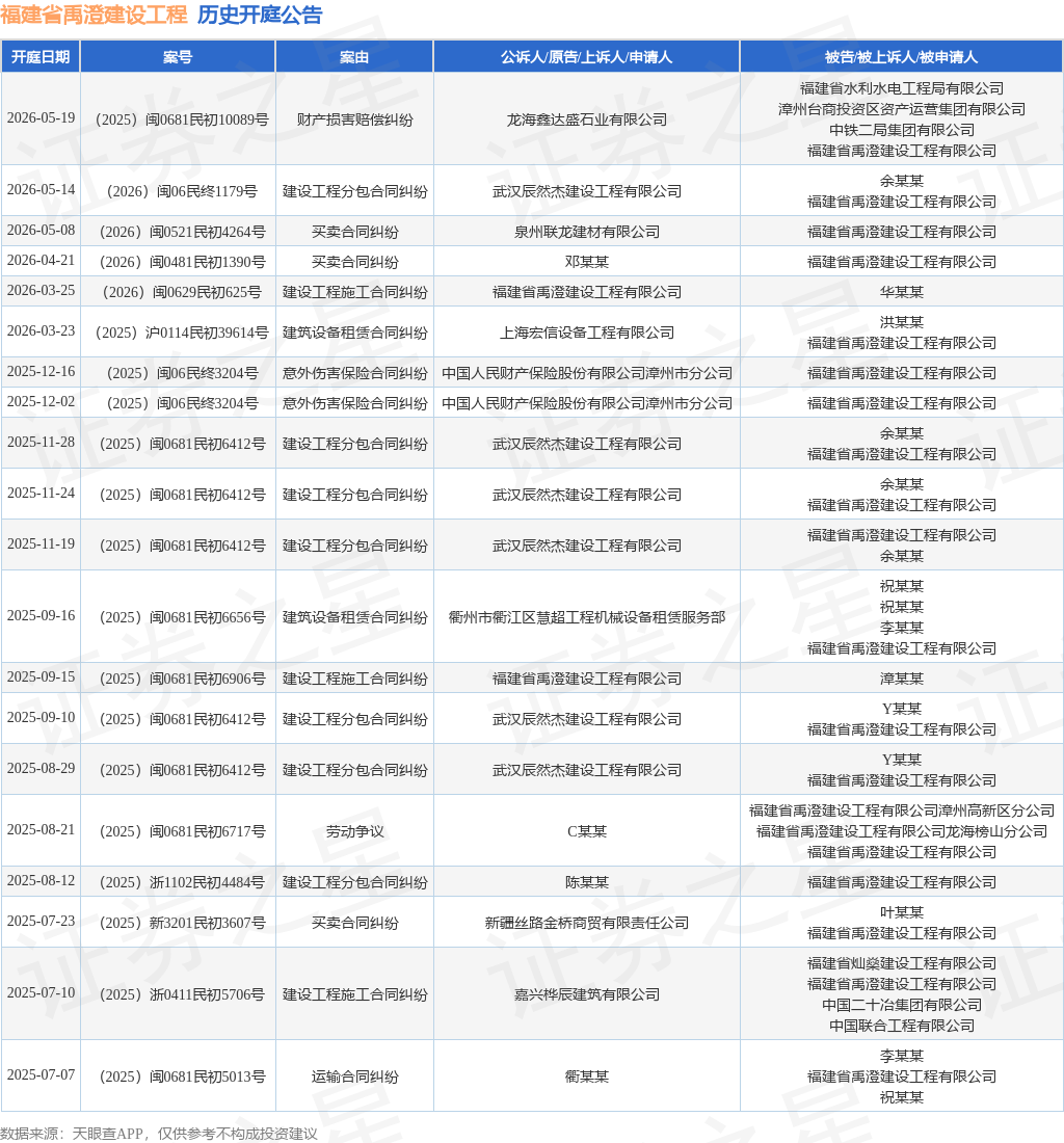案号:(2026)闽0481民初1390号根据统计,近一年内以福建省禹澄建设工程有限公司为当事人的历史开庭公告有21则,其中案由为“建设工程分包合同纠纷”的公告以7则居首,其次为“建设工程施工合同纠纷”有4则,“买卖合同纠纷”有3则。历史开庭公告(前20条)如下:
